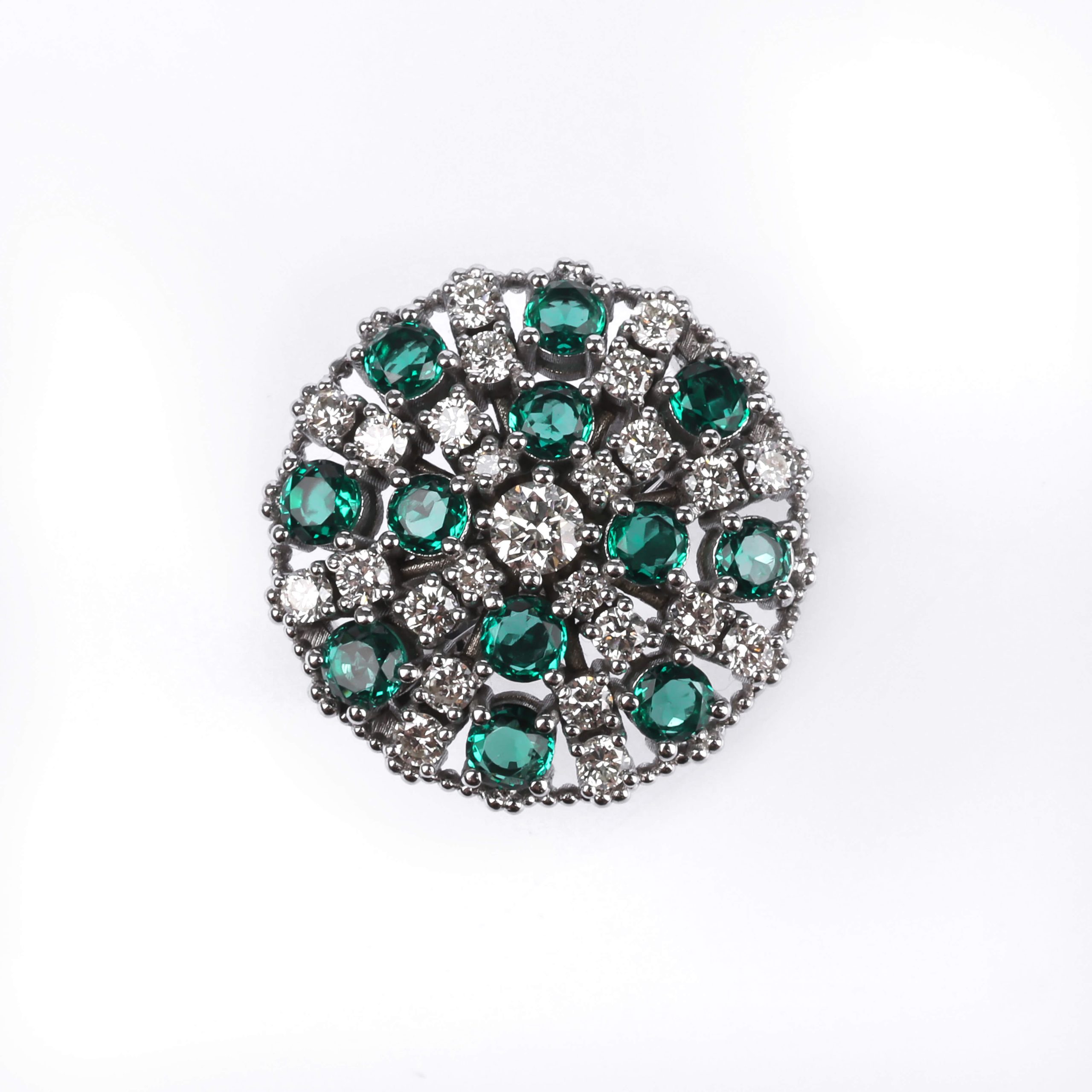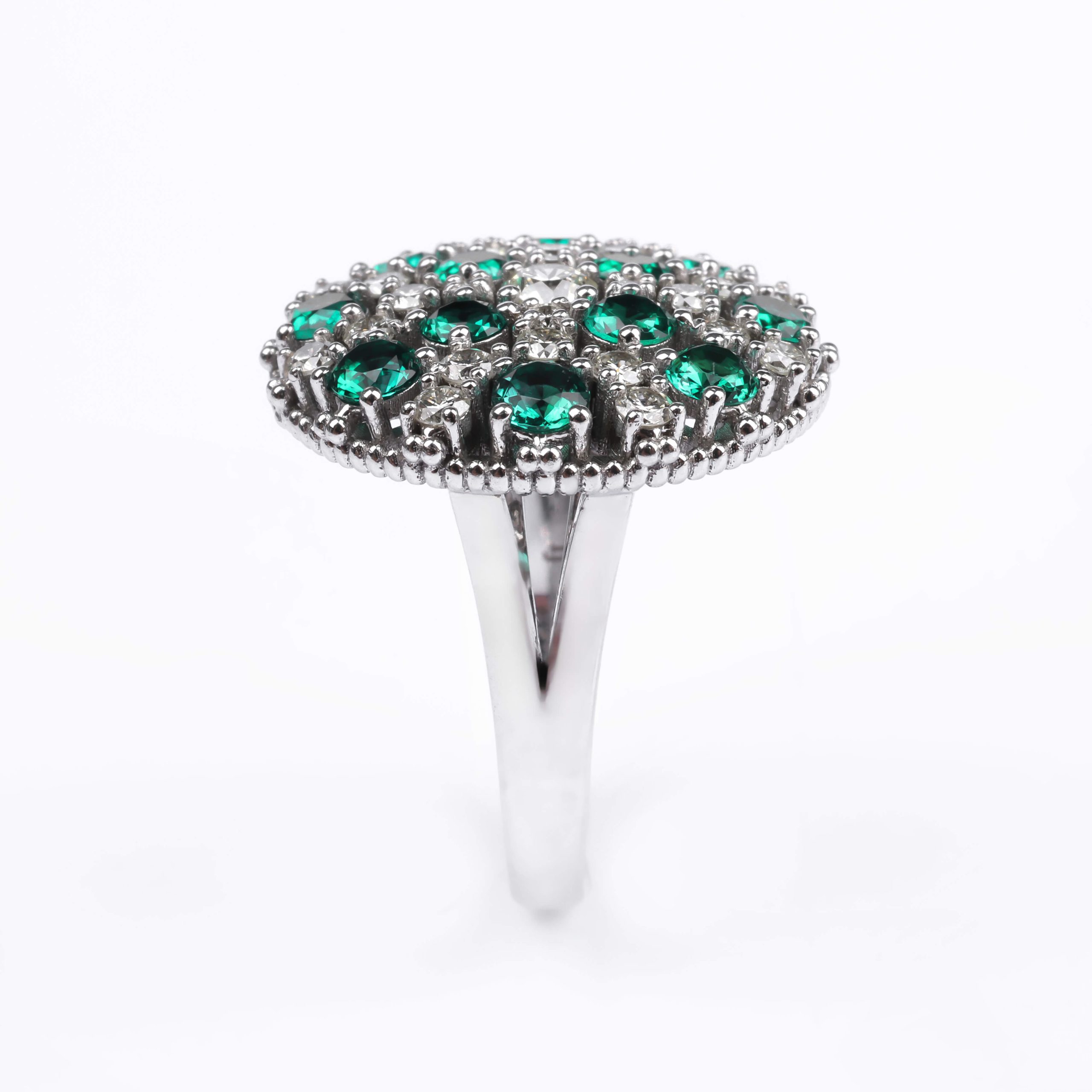 585 հարգի սպիտակ ոսկուց մատանի՝ 8.41 գ ընդհանուր քաշով։ Զարդարված է 12 հատ զմրուխտներով (ընդհանուր 1.11 կարատ) և ադամանդներով՝ 24 հատ round (JK/SI, 0.73 կարատ) ու 1 հատ round ադամանդ (JK/SI, 0.18 կարատ), որոնք ստեղծում են վառ և շքեղ փայլ։ Տպավորիչ և էլեգանտ զարդ՝ գեղեցիկ նվեր նրա համար։