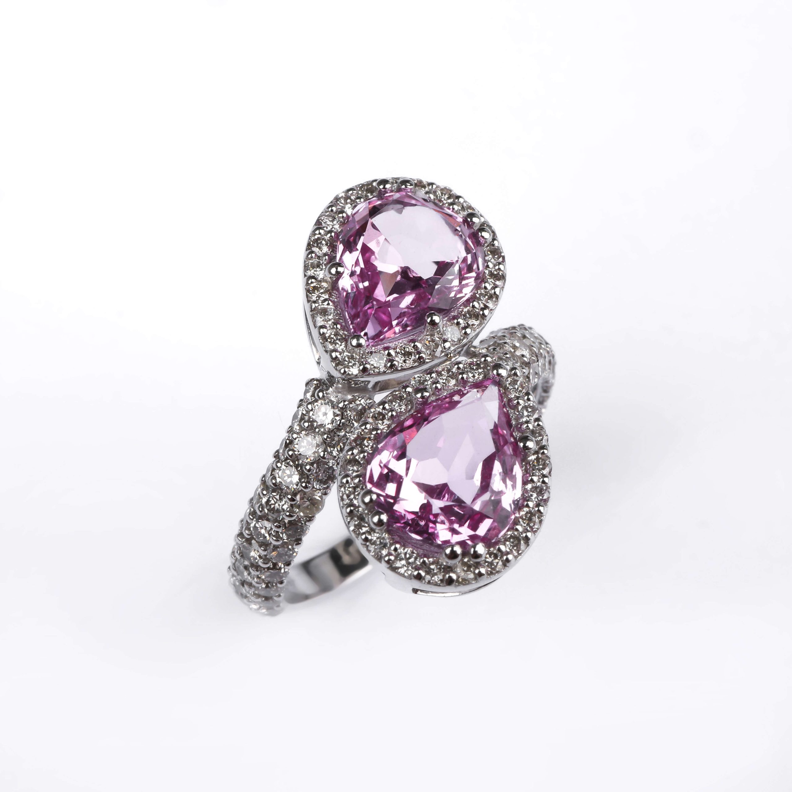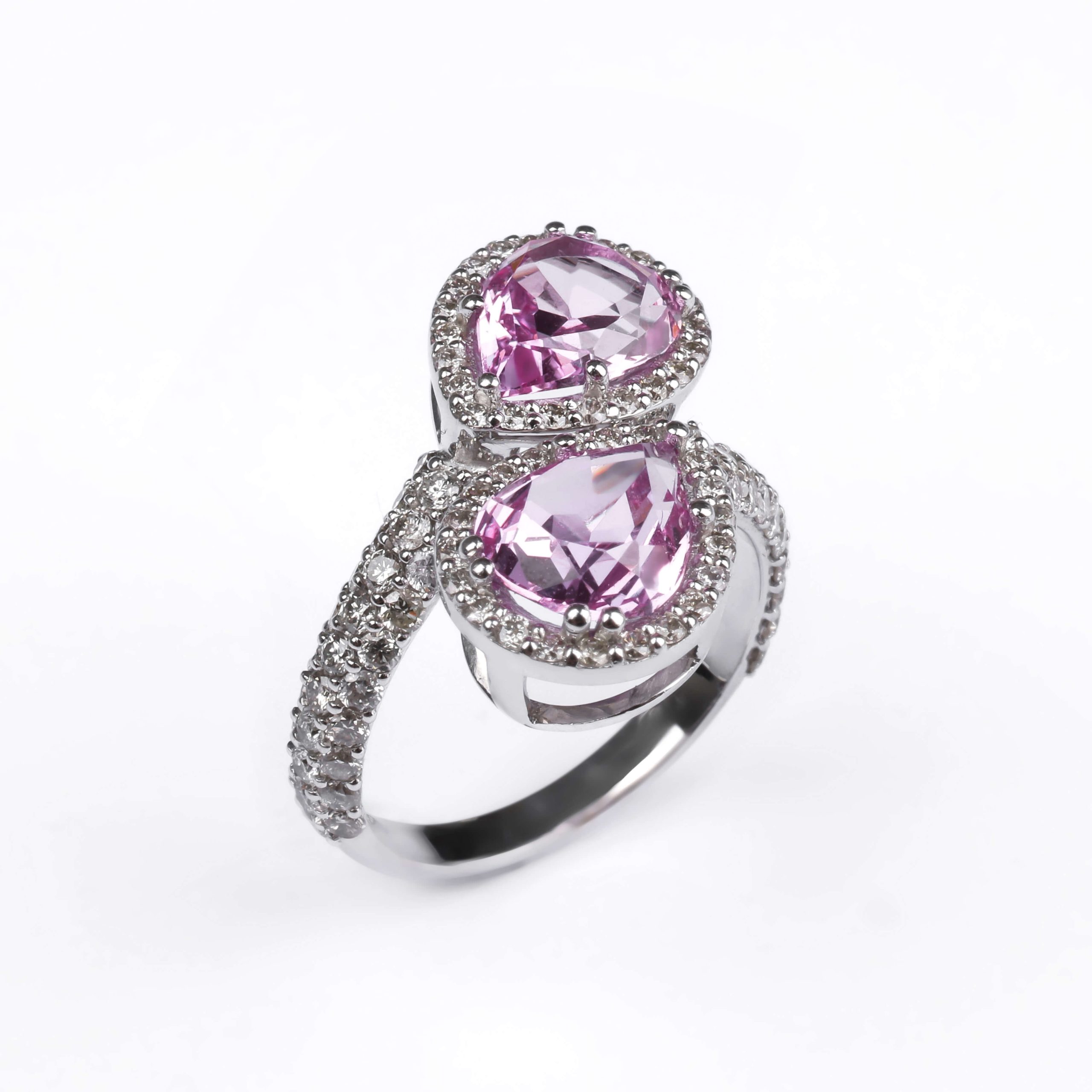 585 հարգի սպիտակ ոսկուց մատանի՝ 5.11 գ ընդհանուր քաշով։ Զարդարված է 2 հատ վարդագույն տոպազ քարերով (ընդհանուր 3.95 կարատ) և 104 հատ round ադամանդներով (HI/SI, 1.216 կարատ), որոնք ստեղծում են վառ գույնի և փայլի ներդաշնակ համադրություն։ Նրբագեղ և արտահայտիչ զարդ՝ գեղեցիկ նվեր նրա համար։