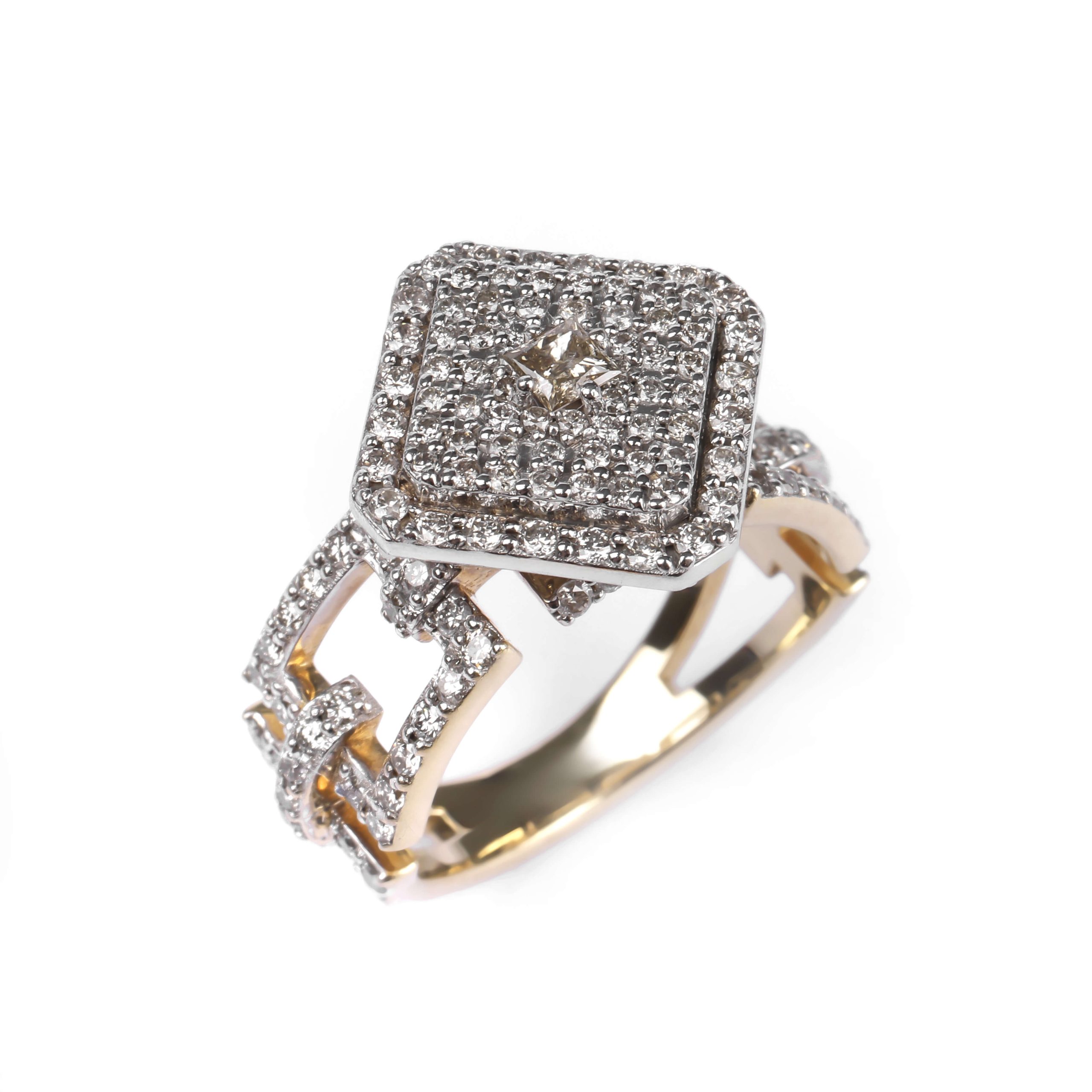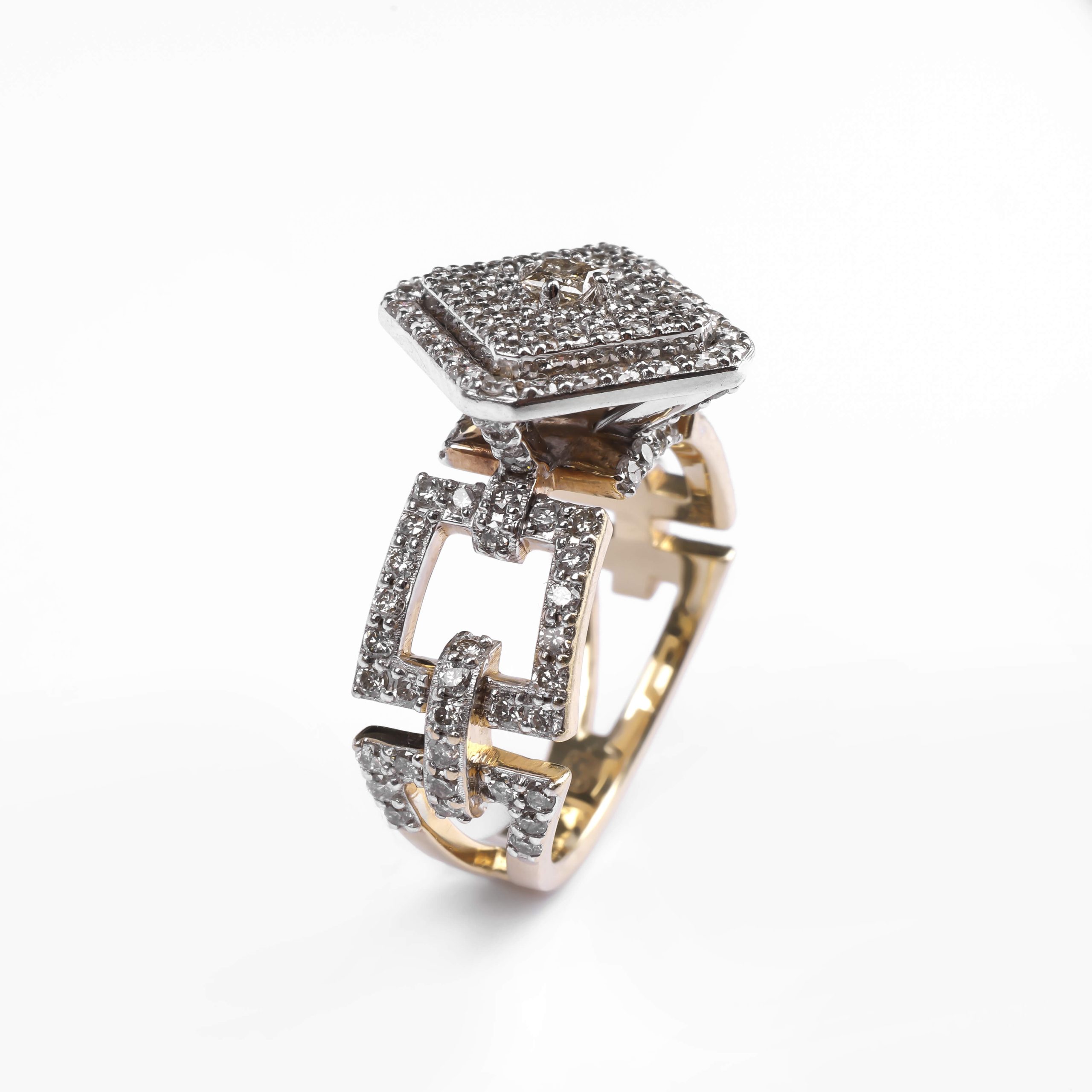 585 հարգի դեղին ոսկուց մատանի՝ 6.8 գ ընդհանուր քաշով։ Զարդարված է 164 հատ round ադամանդներով (HI/SI, ընդհանուր 1.27 կարատ) և մեկ princess կտրվածքով շագանակագույն ադամանդով (0.15 կարատ), որոնք ստեղծում են վառ և յուրահատուկ փայլ։ Տպավորիչ և նրբագեղ զարդ՝ գեղեցիկ նվեր նրա համար։