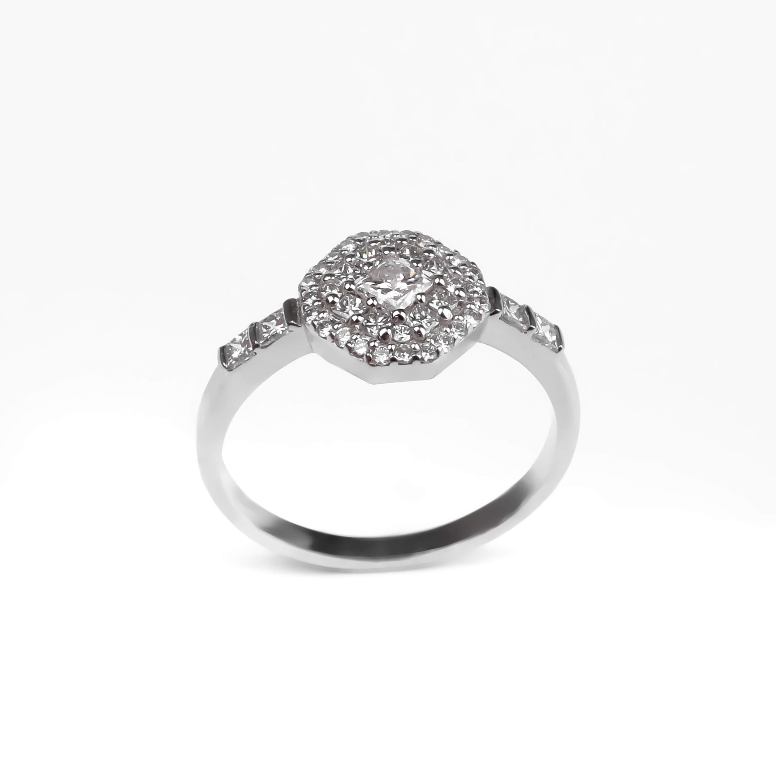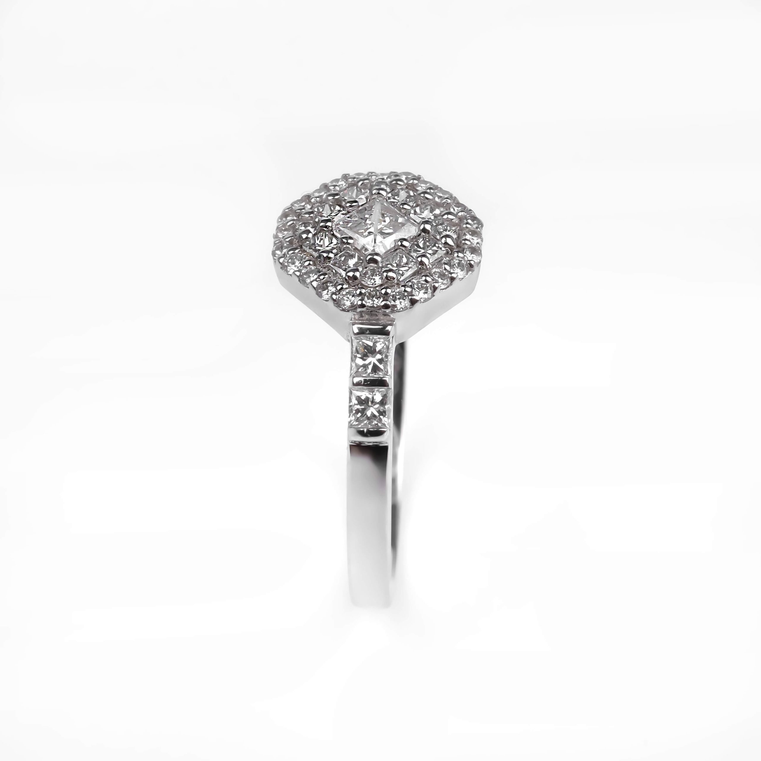 585 հարգի սպիտակ ոսկուց մատանի՝ 2.51 գ ընդհանուր քաշով։ Զարդարված է ադամանդներով տարբեր կտրվածքներով՝ 24 հատ round (D–G/VS, 0.105 կարատ) և 13 հատ princess ադամանդներով (FG/VS, ընդհանուր 0.462 կարատ), որոնք ստեղծում են նուրբ և արտահայտիչ փայլ։ Էլեգանտ և ժամանակակից զարդ՝ գեղեցիկ նվեր նրա համար։