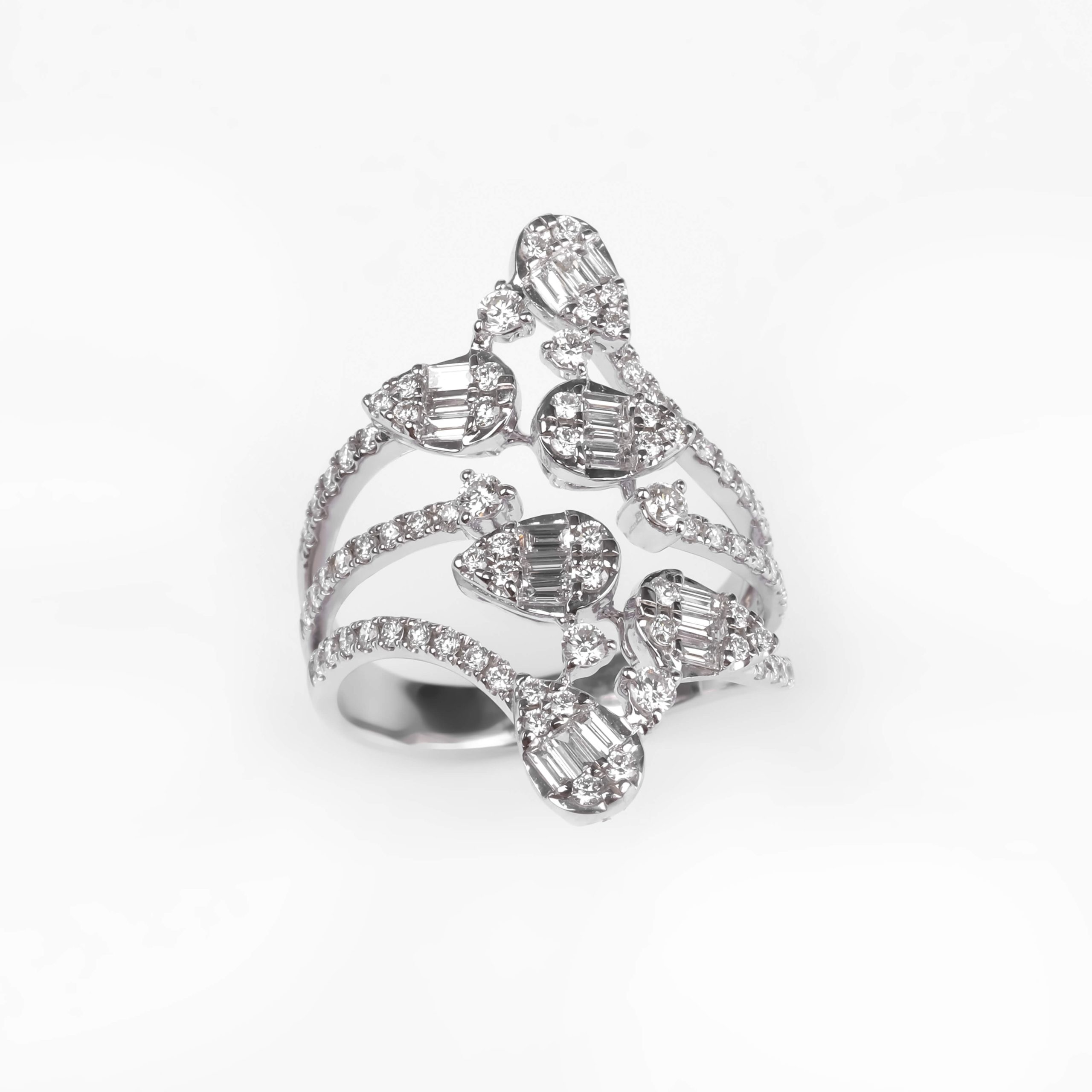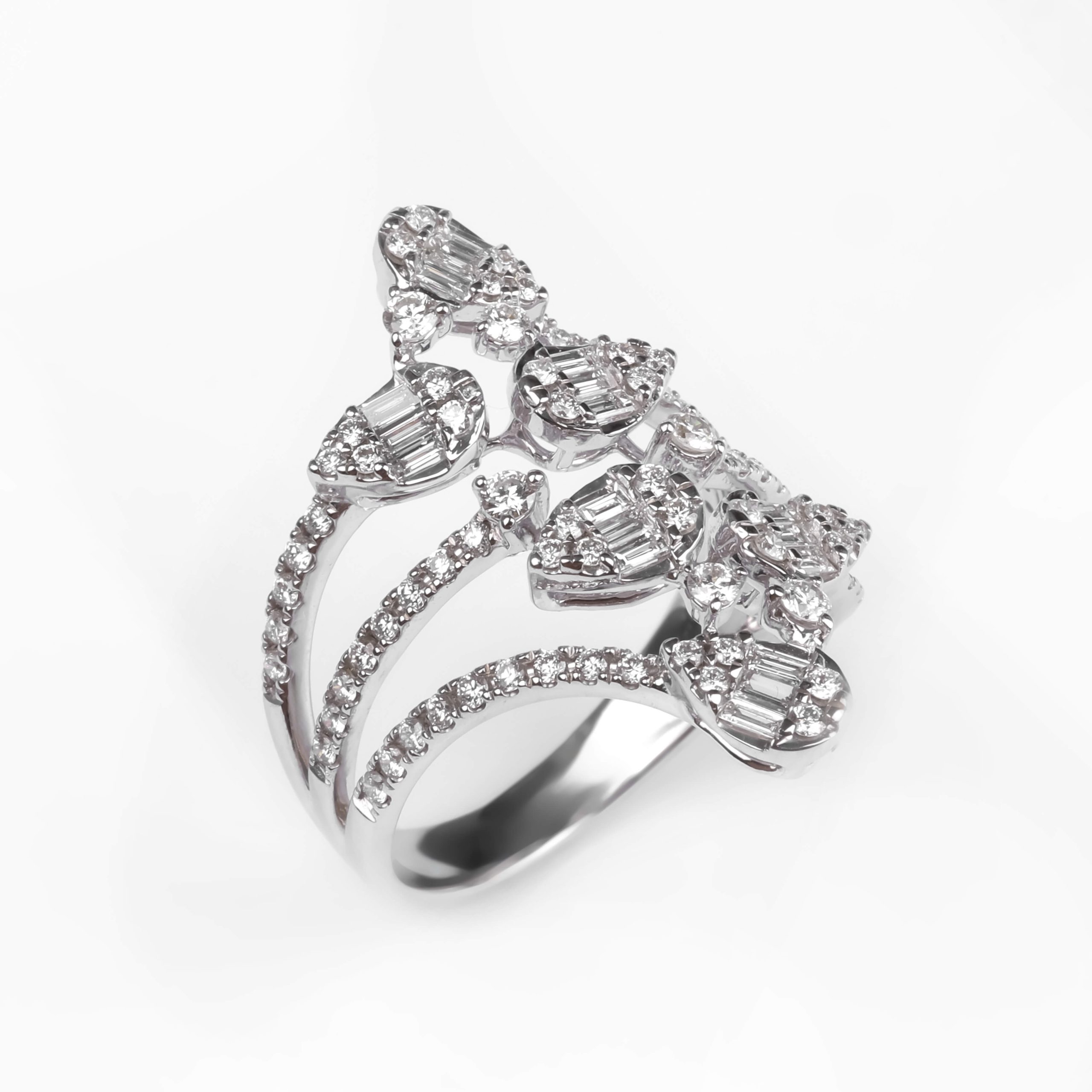 750 հարգի սպիտակ ոսկուց մատանի՝ 5.94 գ ընդհանուր քաշով։ Զարդարված է 80 հատ round ադամանդներով (0.69 կարատ) և 18 հատ baguette ադամանդներով (0.32 կարատ), որոնք ստեղծում են հարուստ և նրբագեղ փայլ։ Շքեղ և էլեգանտ զարդ՝ նախատեսված առանձնահատուկ պահերի համար։