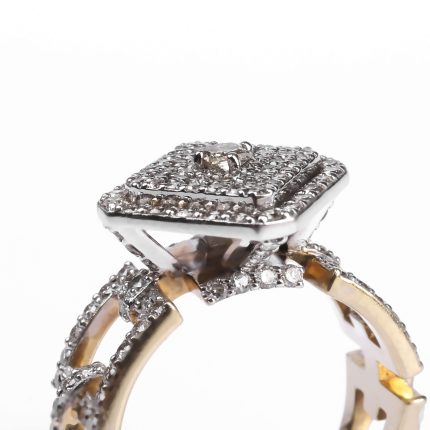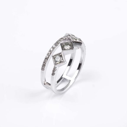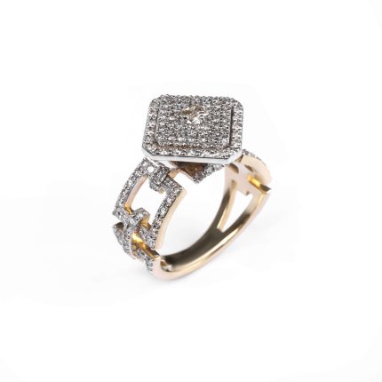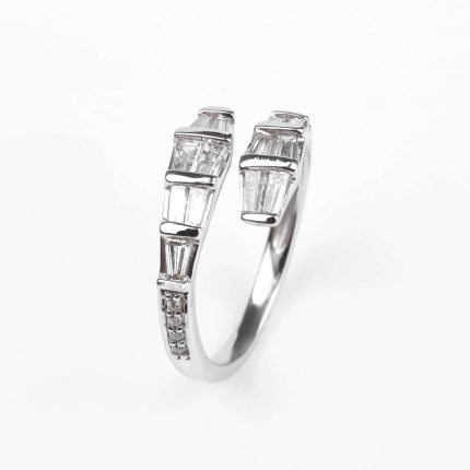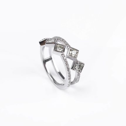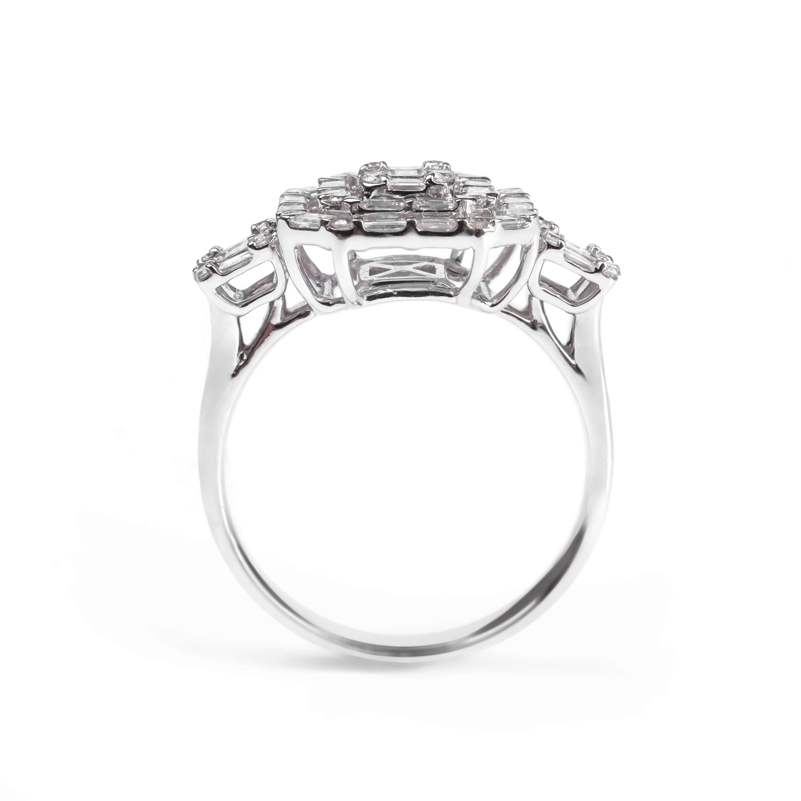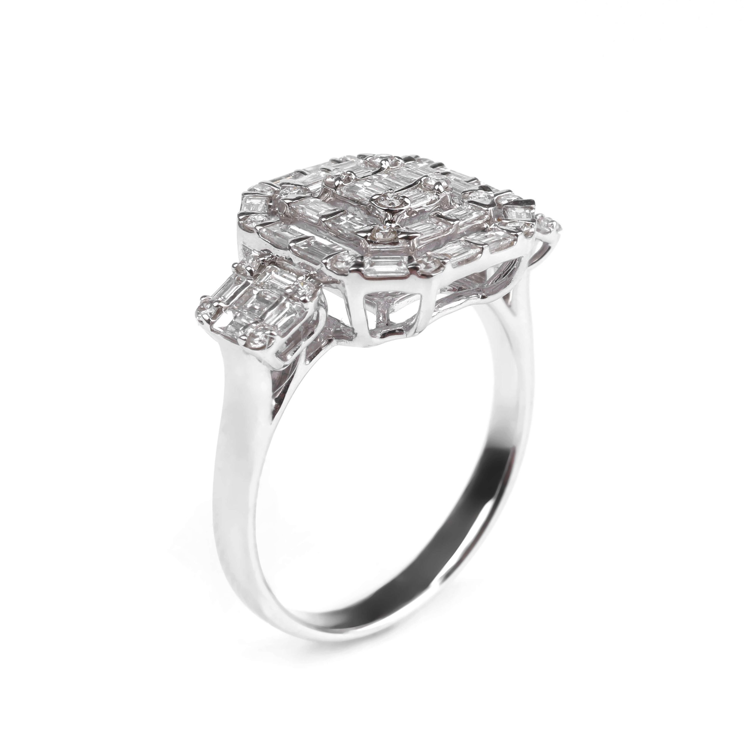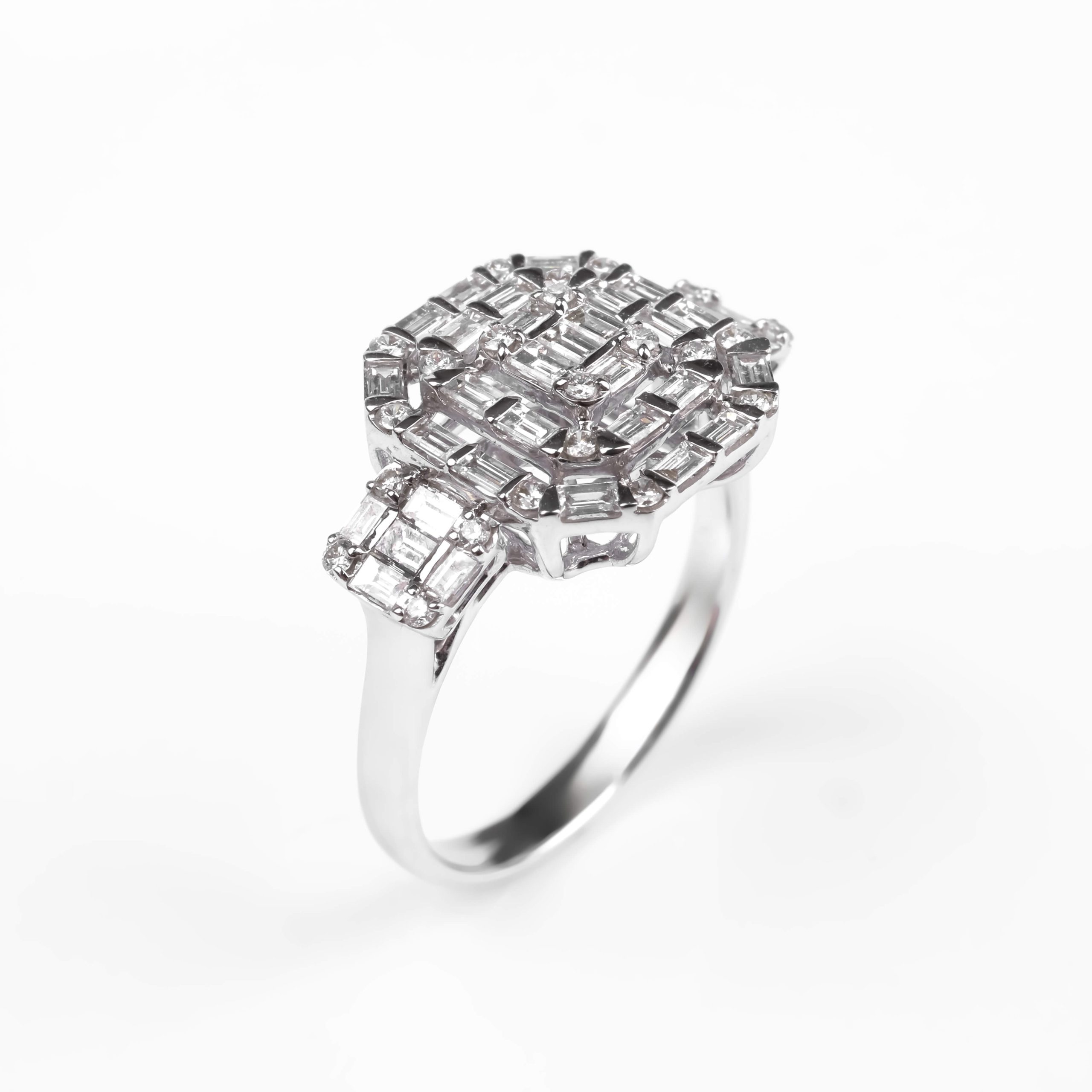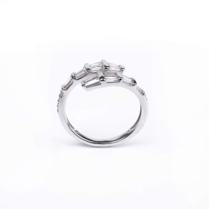 750 հարգի սպիտակ ոսկուց High Jewelry նշանադրության մատանի՝ 4.67 գ ընդհանուր քաշով։ Զարդարված է 24 հատ round ադամանդներով (0.2 կարատ) և 35 հատ baguette ադամանդներով (0.76 կարատ), որոնք ստեղծում են արտահայտիչ և նրբագեղ փայլ։ Շքեղ և էլեգանտ ընտրություն՝ սիրո կարևոր պահերը նշելու համար։