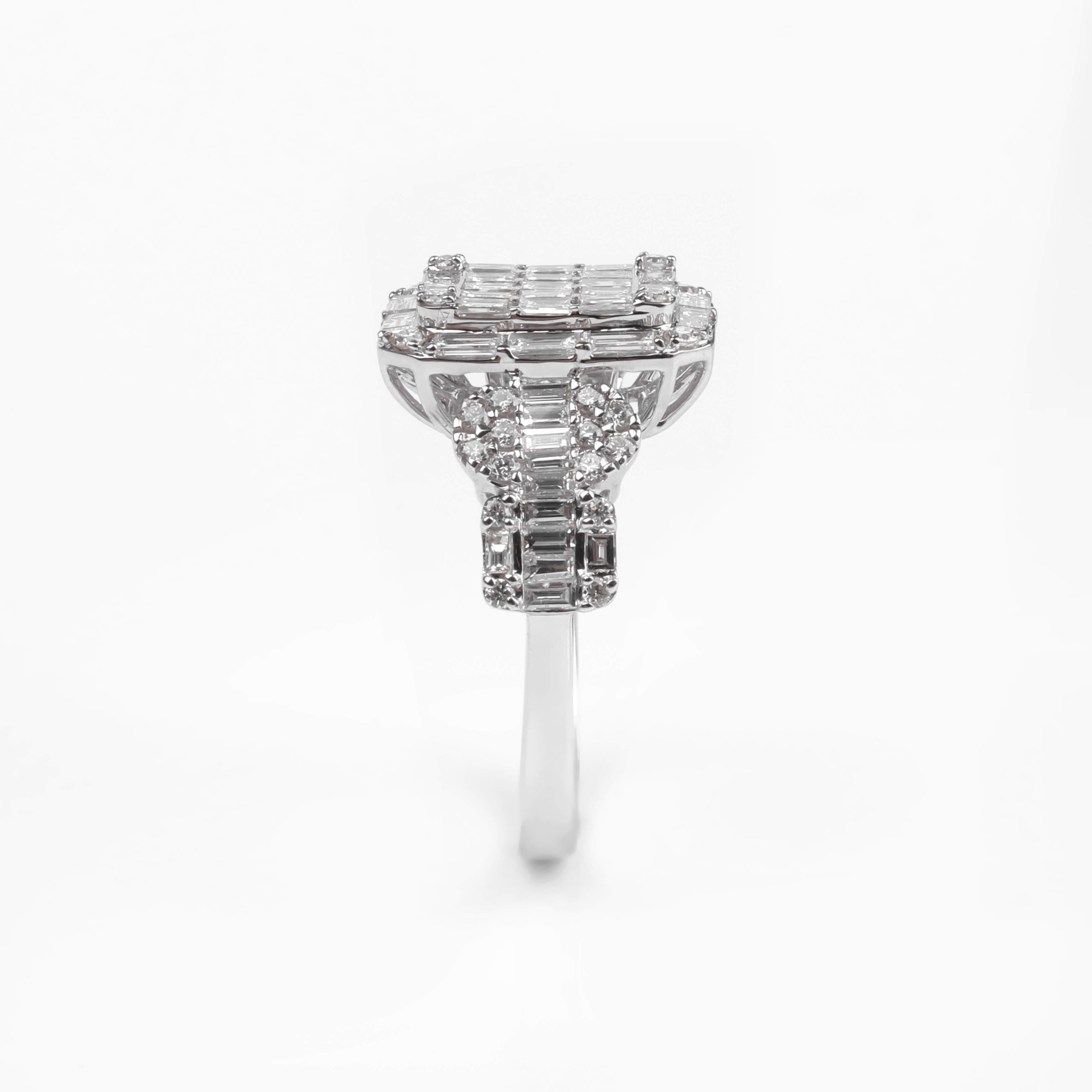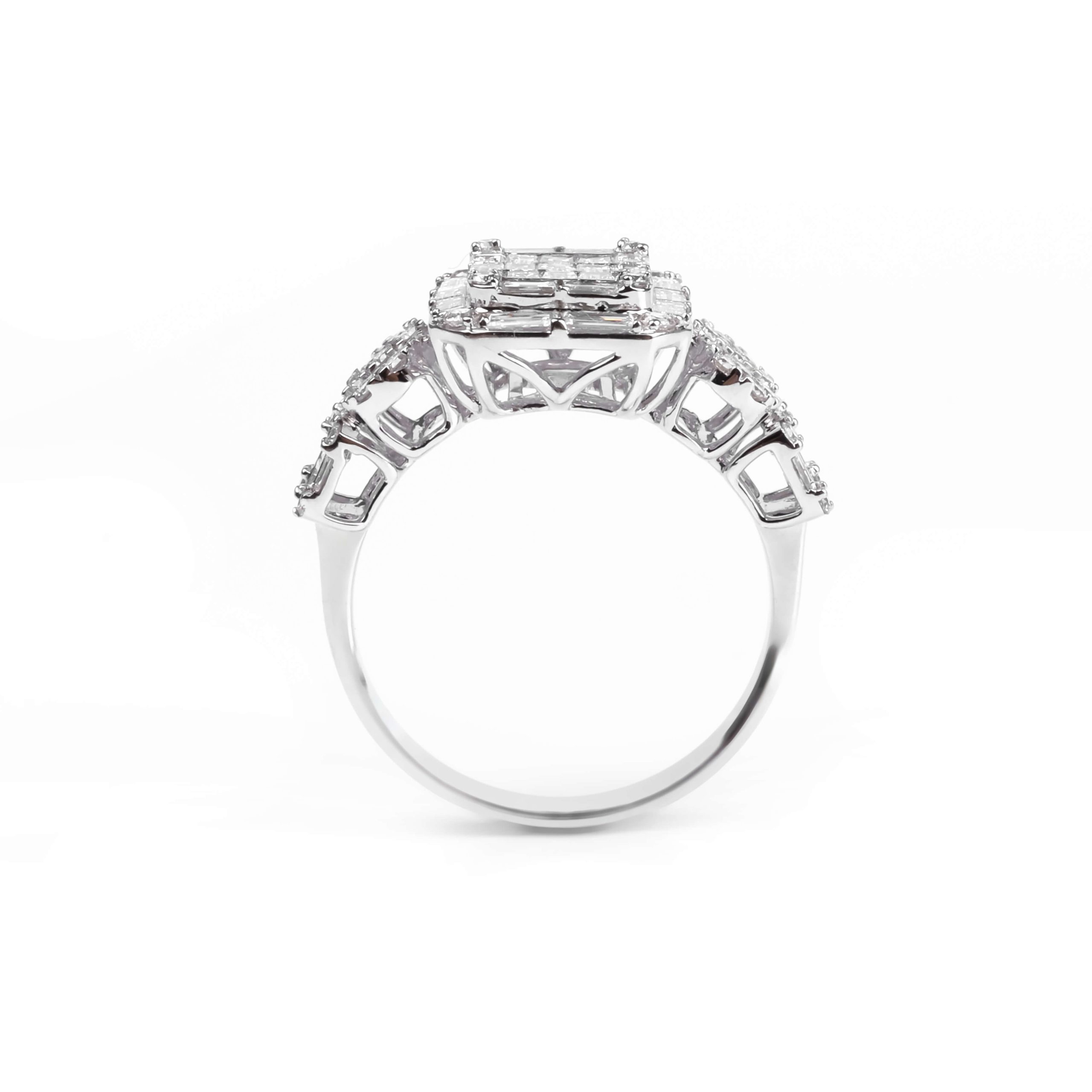 750 հարգի սպիտակ ոսկուց High Jewelry նշանադրության մատանի՝ 4.67 գ ընդհանուր քաշով։ Զարդարված է 24 հատ round ադամանդներով (0.2 կարատ) և 35 հատ baguette ադամանդներով (0.76 կարատ), որոնք ստեղծում են արտահայտիչ և նրբագեղ փայլ։ Շքեղ և էլեգանտ ընտրություն՝ սիրո կարևոր պահերը նշելու համար։