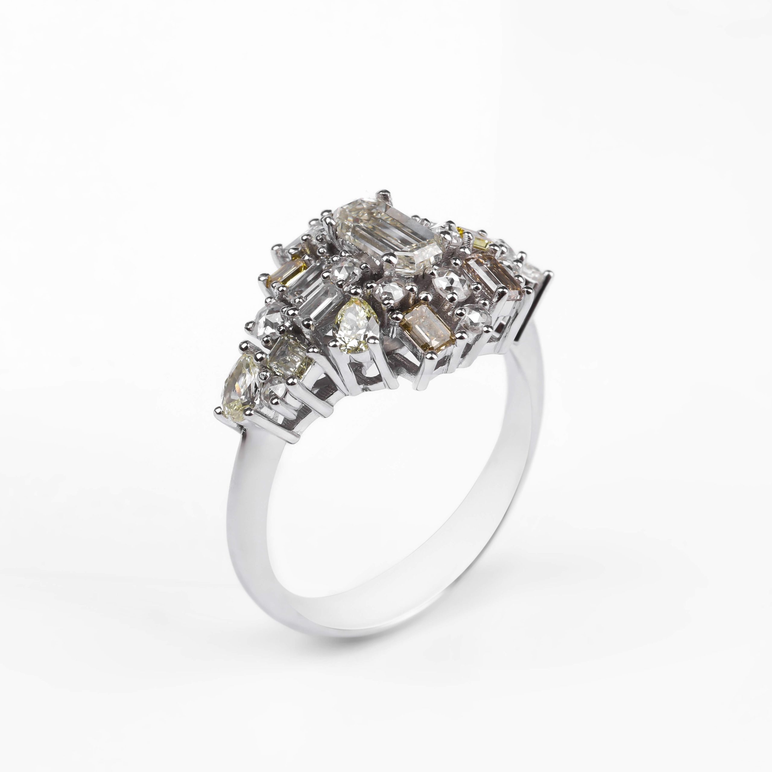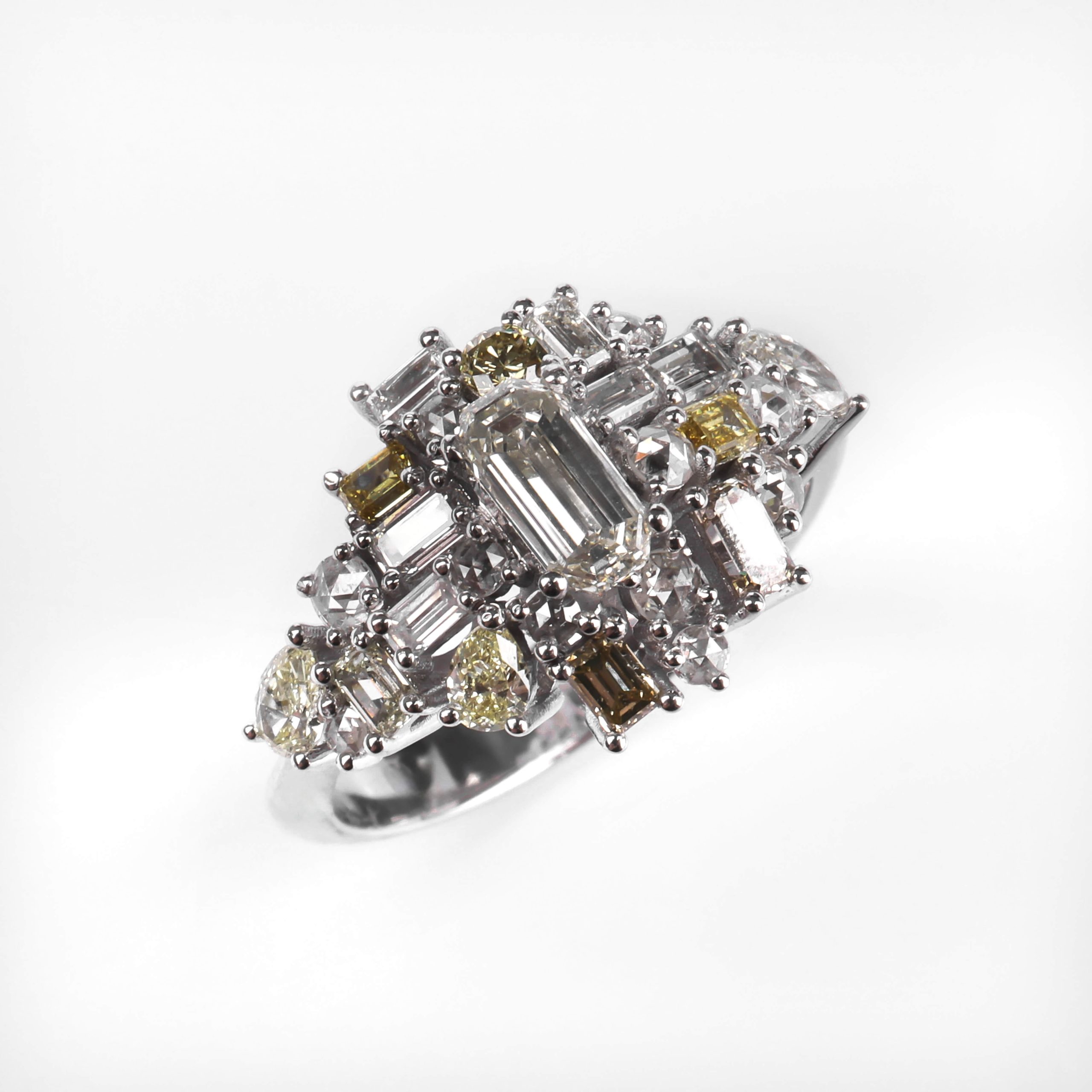 A High Jewelry ring crafted in 750 white gold, with a total weight of 5.31 g. Set with a variety of diamonds in different cuts and shades — including round and rose yellow diamonds, along with marquise, pear, baguette and emerald cuts — creating a unique, multi-dimensional brilliance. An exceptional and expressive piece designed for refined luxury.