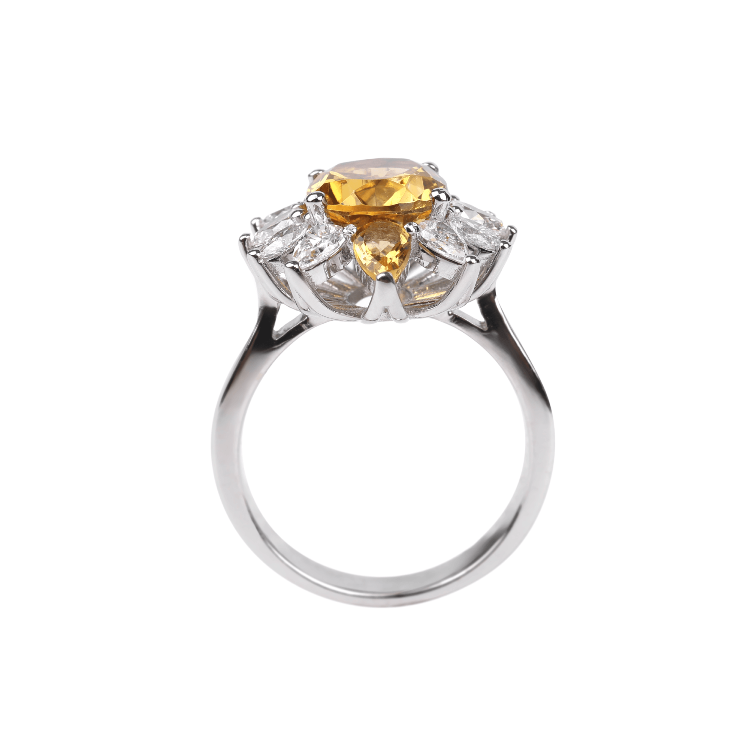 The warm golden hue of citrine adds a vibrant touch of color and enhances the ring’s distinctive elegance.