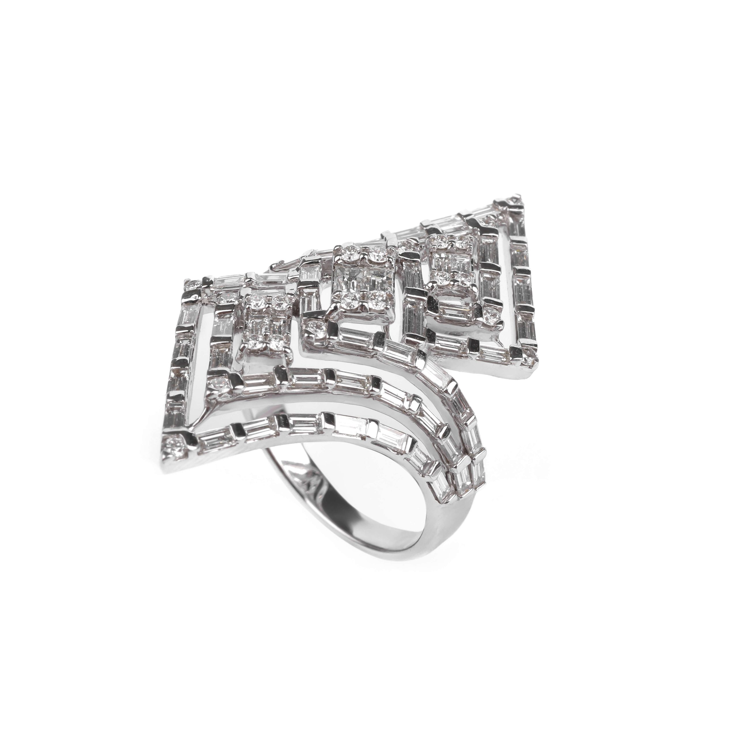 A High Jewelry ring crafted in 750 white gold, with a total weight of 7.61 g. Set with 22 round diamonds (0.28 ct) and 68 baguette-cut diamonds (1.52 ct), creating bold, architectural brilliance. A striking expression of modern luxury and refined craftsmanship.
