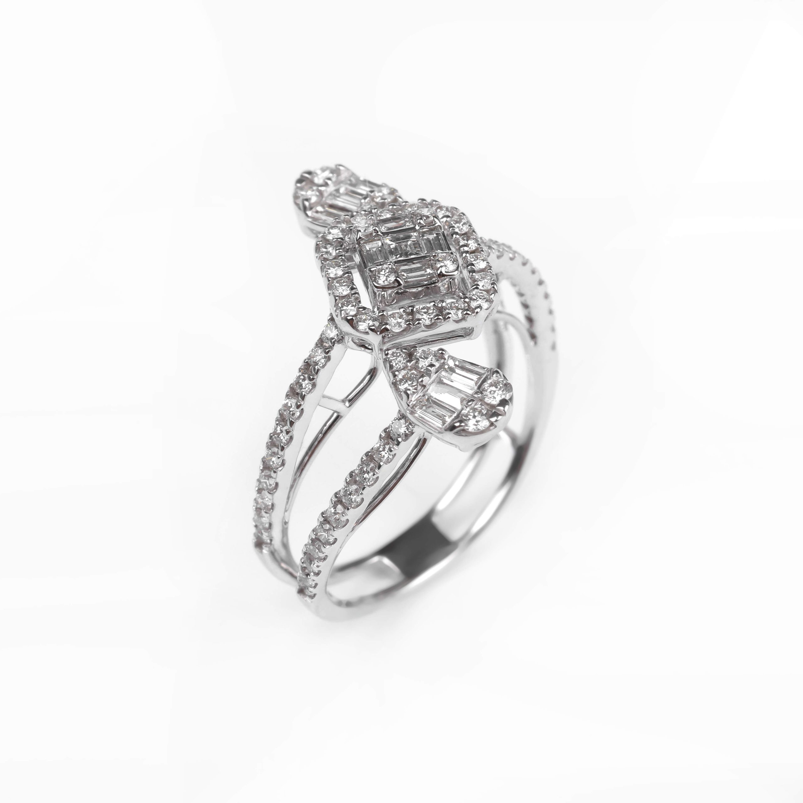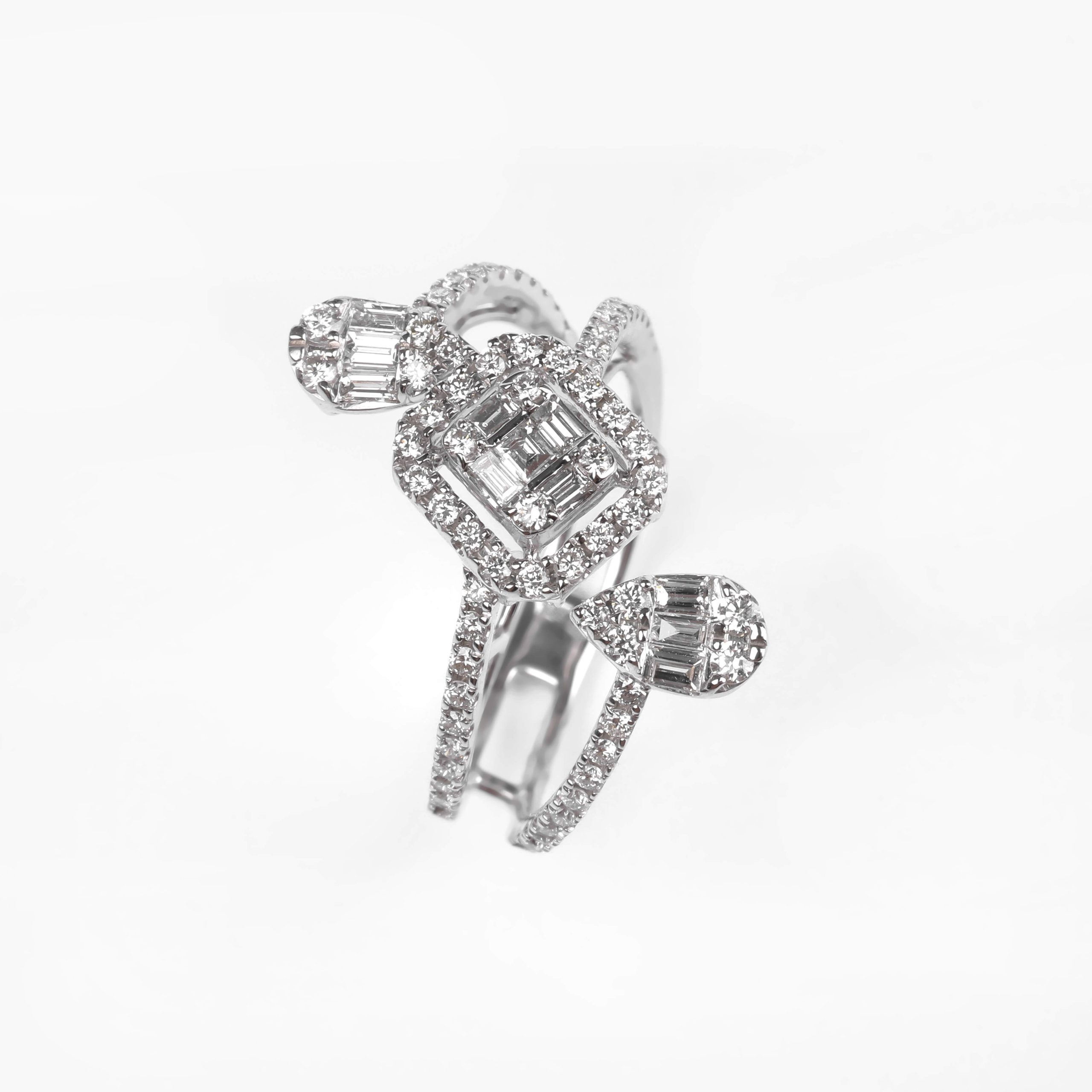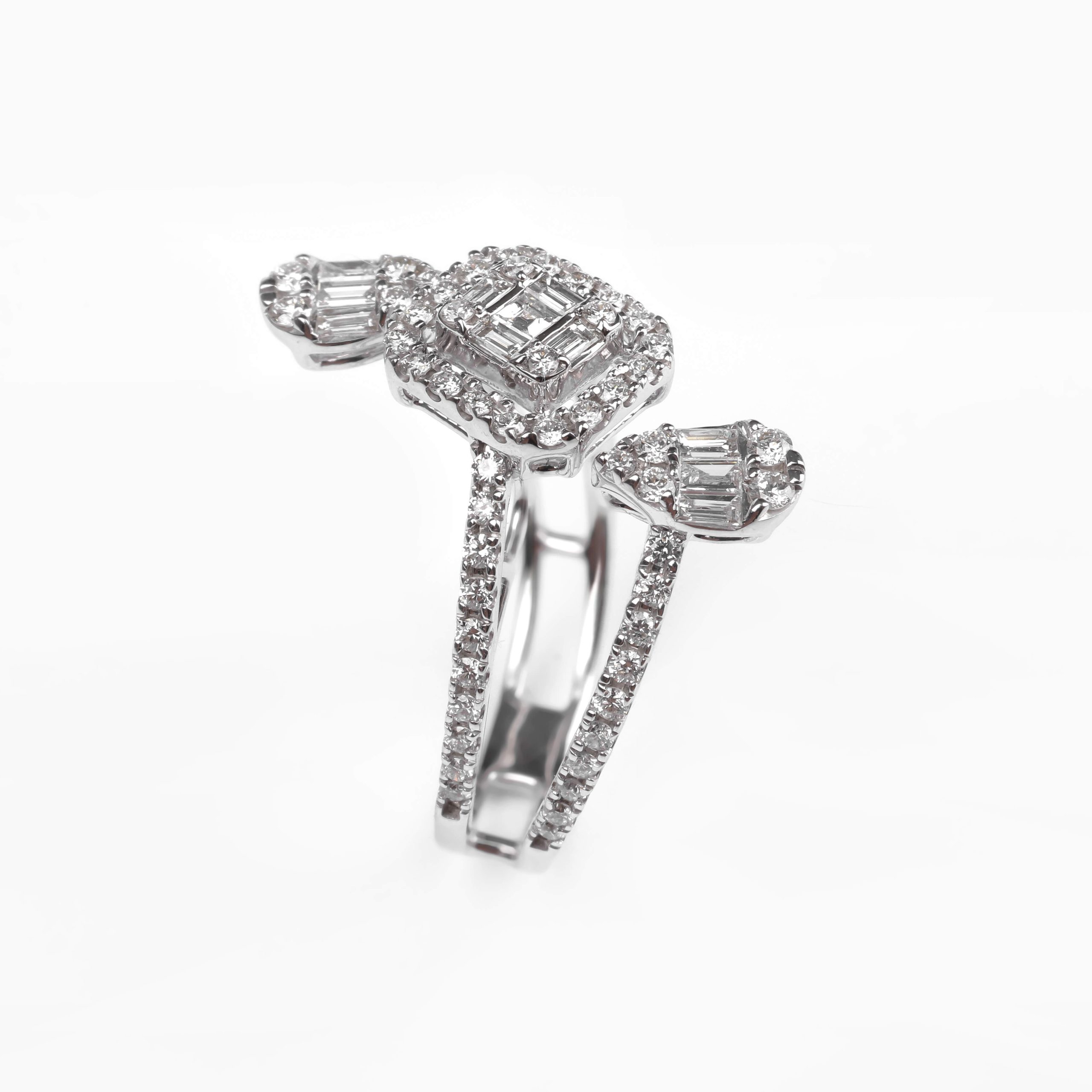 A High Jewelry ring crafted in 750 white gold with a total weight of 4.26 g. Set with 72 round diamonds (0.62 ct) and 11 baguette-cut diamonds (0.26 ct), creating refined and radiant brilliance. A luxurious and elegant piece designed to highlight a distinctive style.